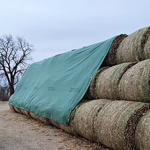 Breathable Hay Tarps maintain freshness, minimize nutrient loss, and maximize yield! This innovative fabric is lightweight, water-resistant, and nearly impossible to tear. Rain rolls right off as long as your hay is stacked with a tight 45° slope. Any trapped moisture evaporates, leaving your hay crisp and dry. They are significantly easier to install than conventional polyethylene tarps and will not billow in the wind, thanks to their lightweight and breathable properties. Conventional tarps are bulky and require numerous straps and tie-downs to install, but these revolutionary hay tarps are held in place just by tacking hay tarp pins through the material into your hay.
