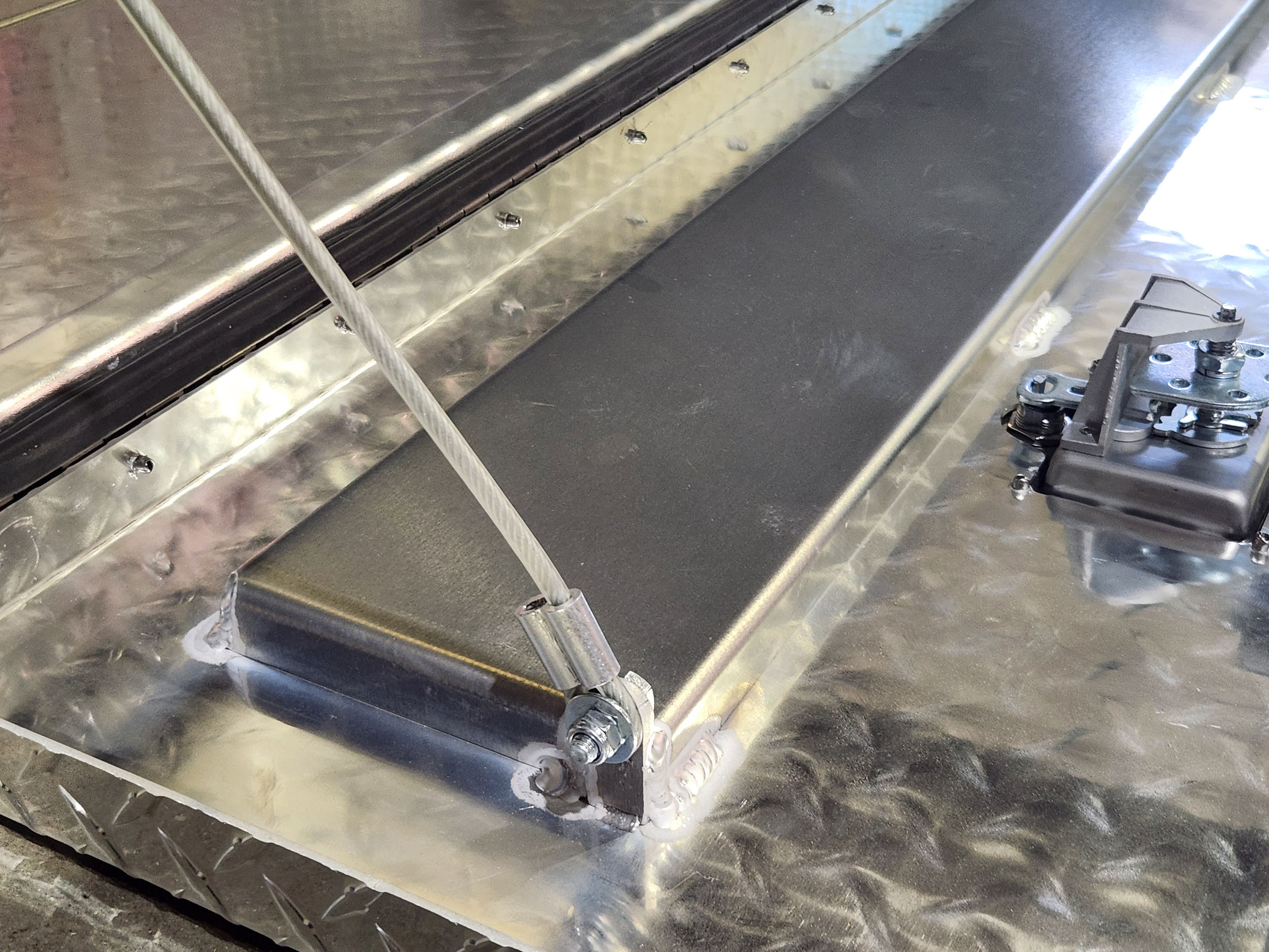 This toolbox is designed to mount underneath the deck or body of your trailer, but can be mounted any way you want. The box is made of heavy duty diamond plate aluminum with water and air-tight welds at the corners for structural integrity. The single door opens vertically and is supported by two 1/4" steel cables at each corner. The door frame is lined with a rubber seal to keep out water, as are the riveted side-carry handles, resulting in a strong, secure, and waterproof tool box to keep your valuable tools and equipment safe and dry. Mounting brackets sold separately.