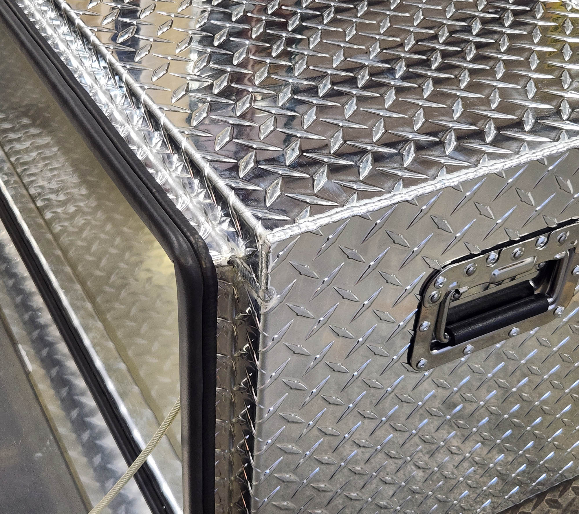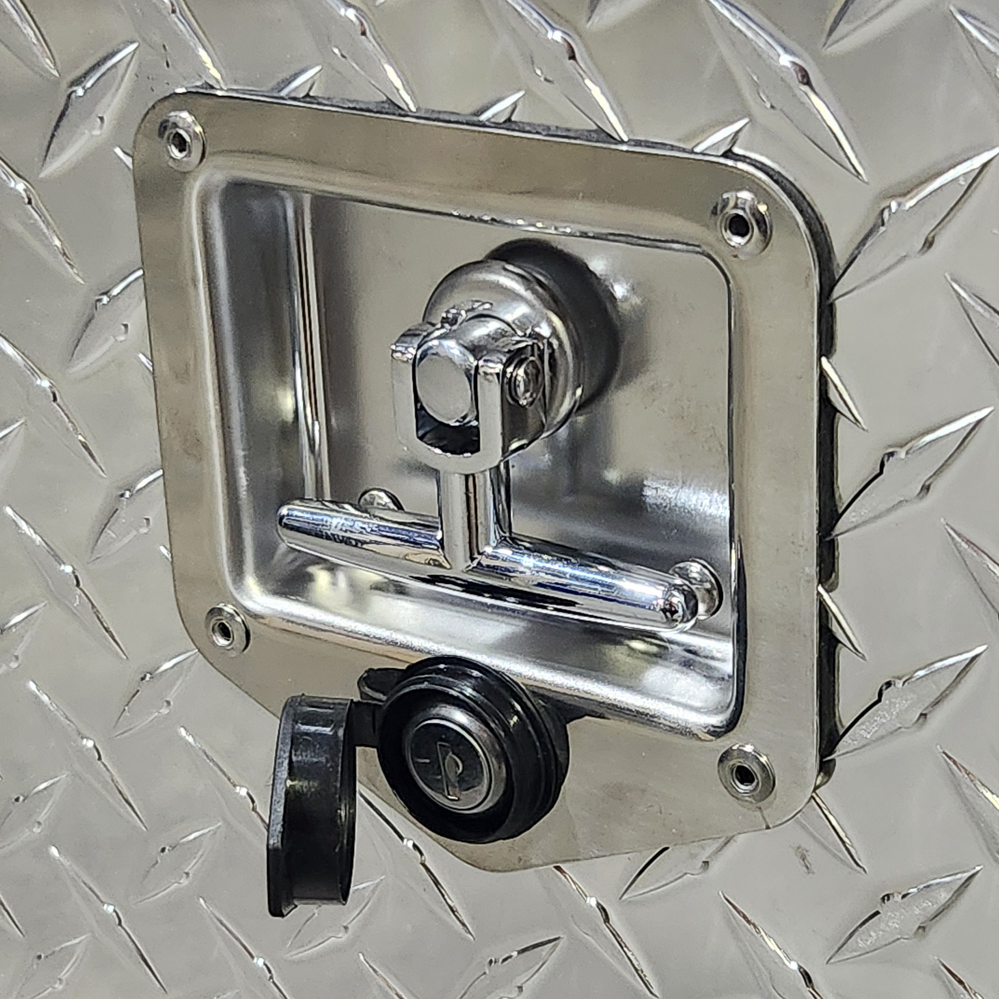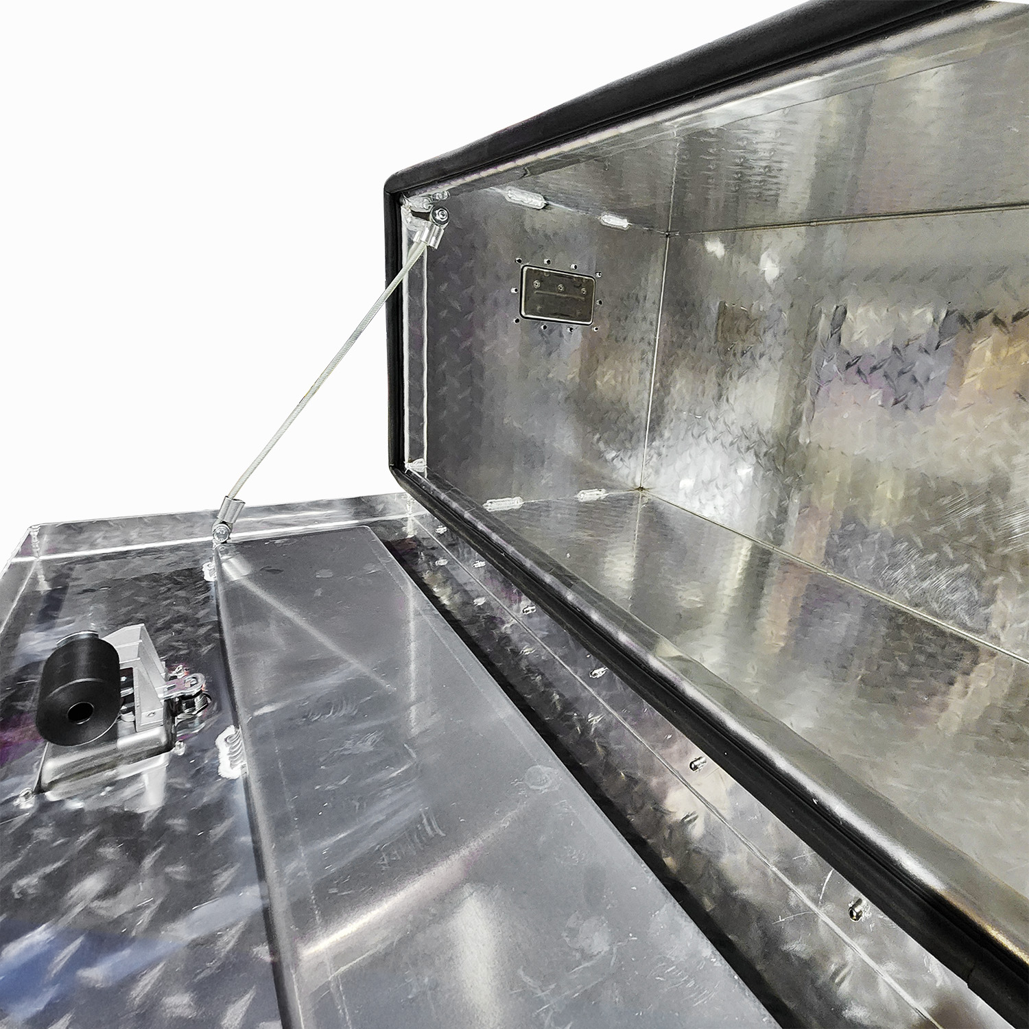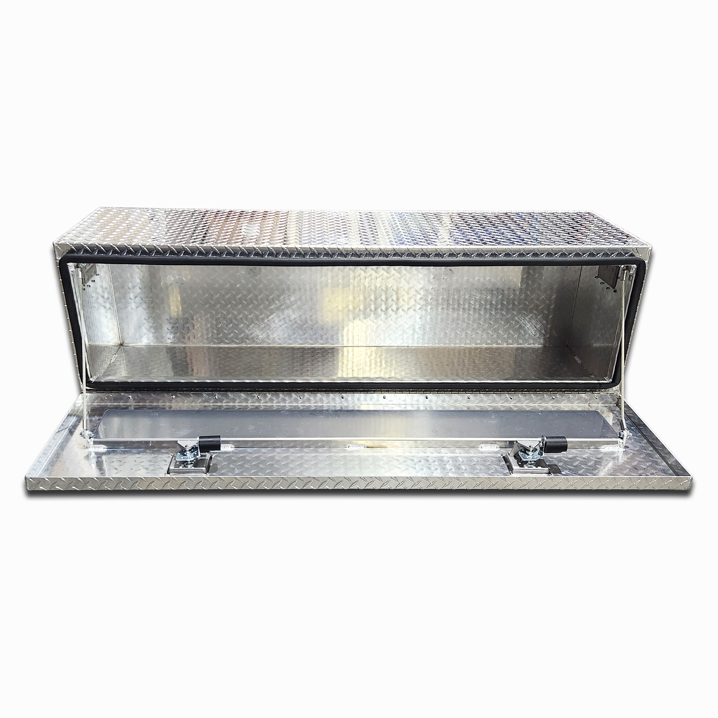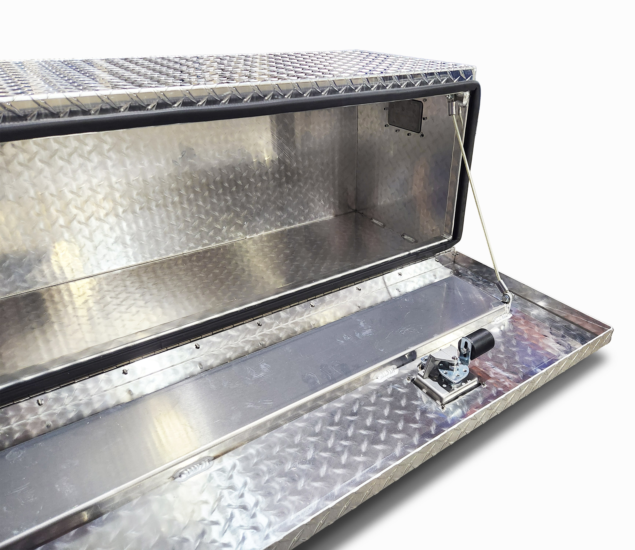 This toolbox is designed to mount underneath the deck or body of your trailer, but can be mounted any way you want. The box is made of heavy duty diamond plate aluminum with water and air-tight welds at the corners for structural integrity. The single door opens vertically and is supported by two 1/4" steel cables at each corner. The door frame is lined with a rubber seal to keep out water, as are the riveted side-carry handles, resulting in a strong, secure, and waterproof tool box to keep your valuable tools and equipment safe and dry. Mounting brackets sold separately.