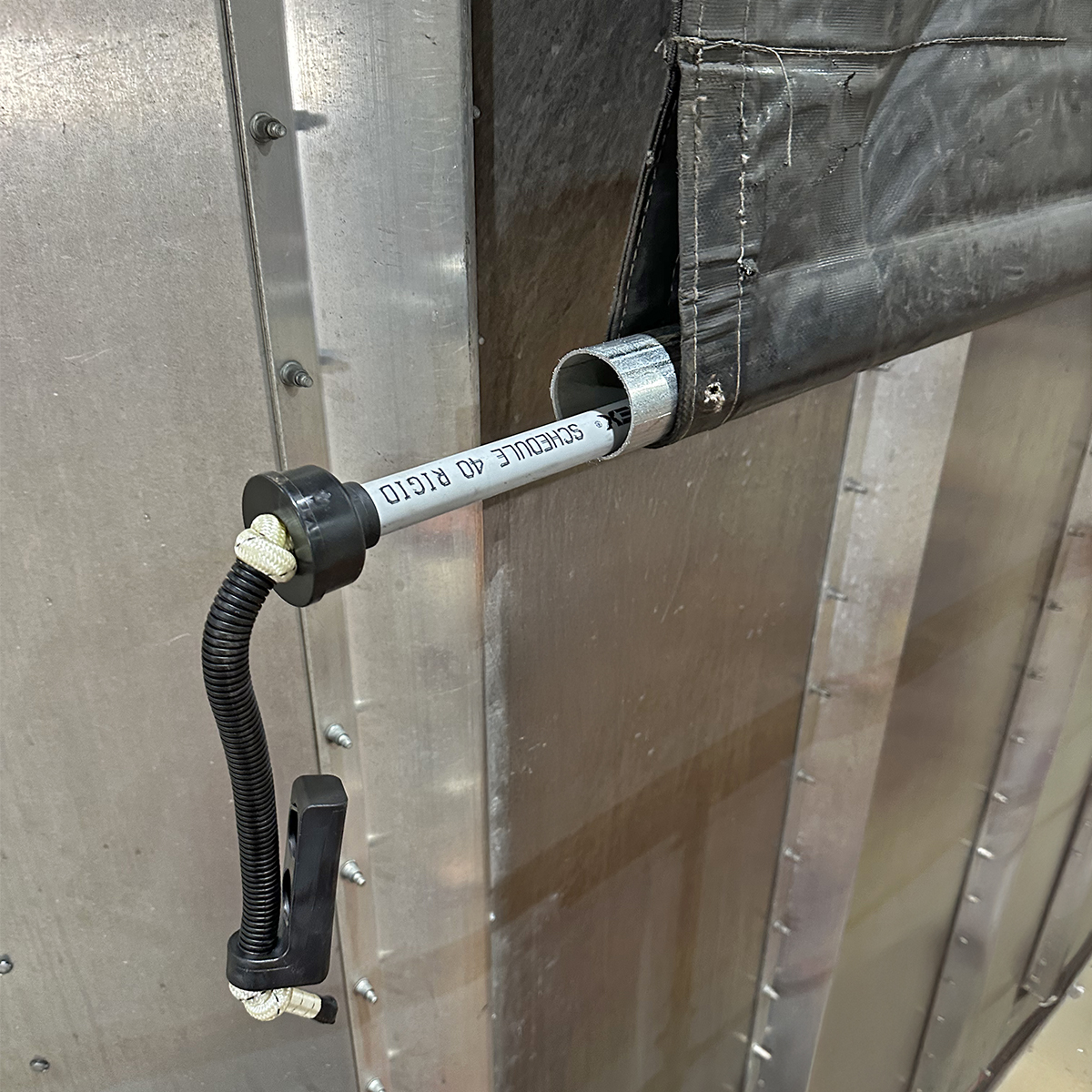 A bungee tarp return kit assists with rolling your side roll trailer tarp to the closed position with a positive return tension. A bungee cord extended through a PVC pipe maintains tension, with knots on either end of the PVC pipe setting the desired tension. The end of the remaining exposed bungee cord is fastened to the side of your trailer, helping to keep the tarp aligned as it rolls and unrolls. When you roll up the tarp to open the trailer, the bungee tension is increased so that when you go to unroll the tarp and close the trailer, the tension stored in the bungee helps pulled the tube to the closed position. Without some kind of assist, it is likely the tarp will deploy unevenly. Note: Bungee and PVC pipe do NOT need to extend the entire length of the roll tube.