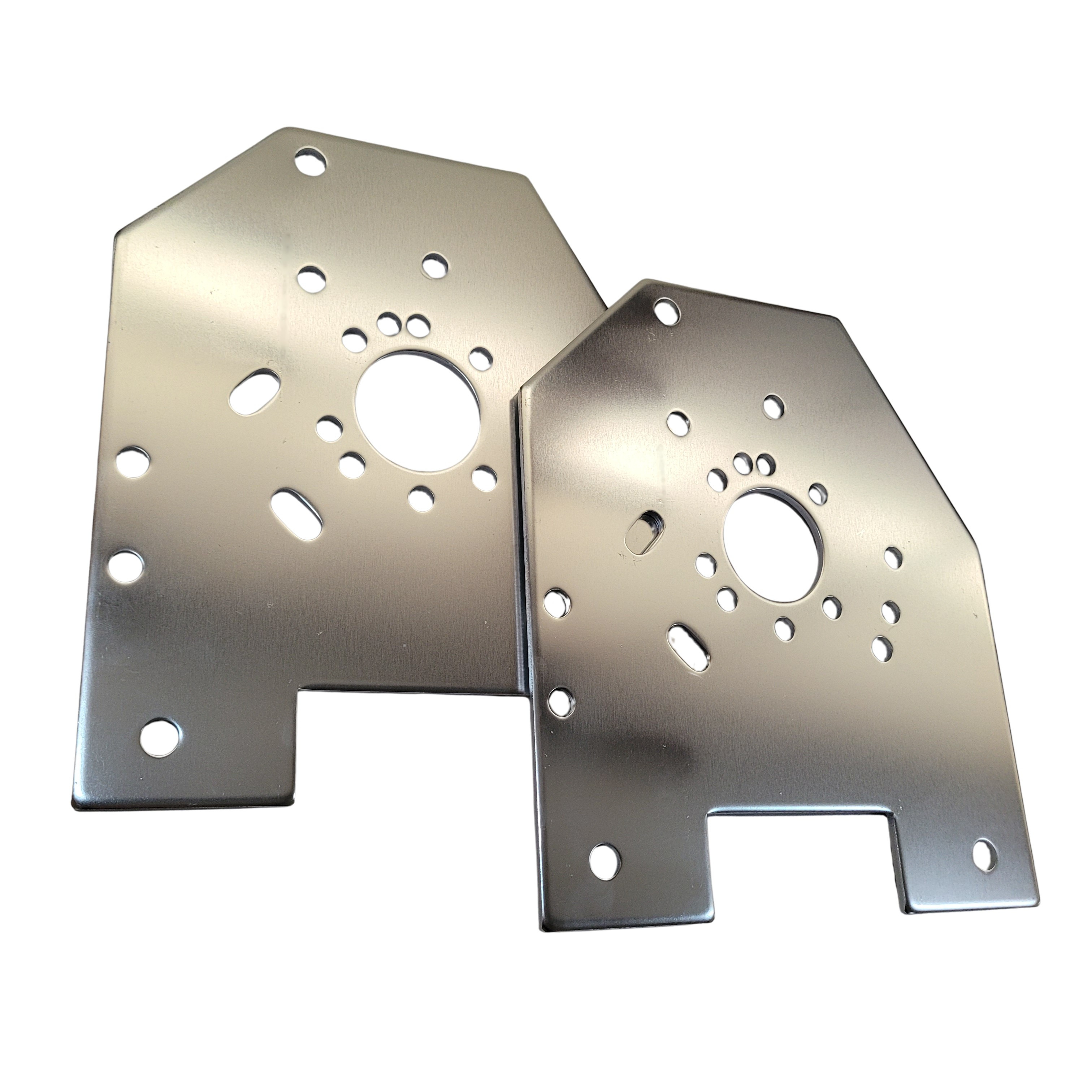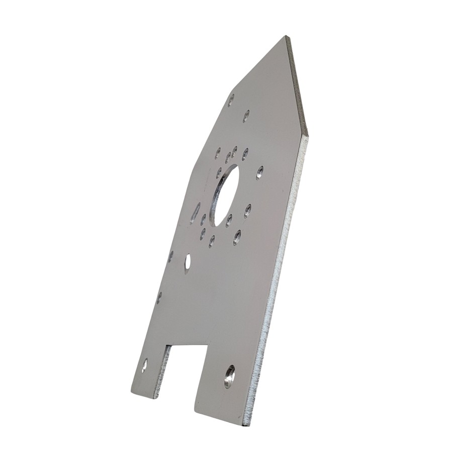 Measures 10 1/2" long and 9" wide, with a 2" center hole and a 1 9/16" x 3 1/2" rectangular cut-out at the bottom. 4 7/8" angle on one side, 3 1/4" angle on the other side. Space between mounting holes is 7" center to center. Bracket thickness is 3/16". Bolt pattern as shown in picture.